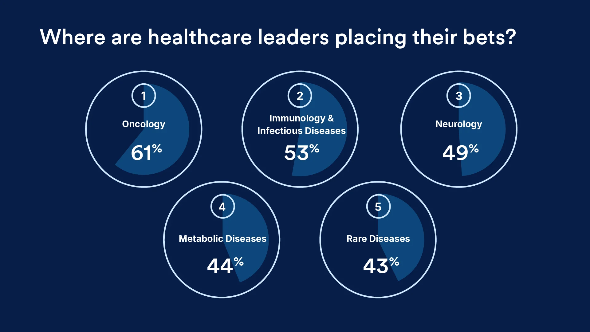 Despite the funding strain, respondents underscored the critical need to fill the pipeline with new and better healthcare solutions for the highest unmet needs in key therapeutic areas. Areas ranked highest for ongoing investigation or investment include:
