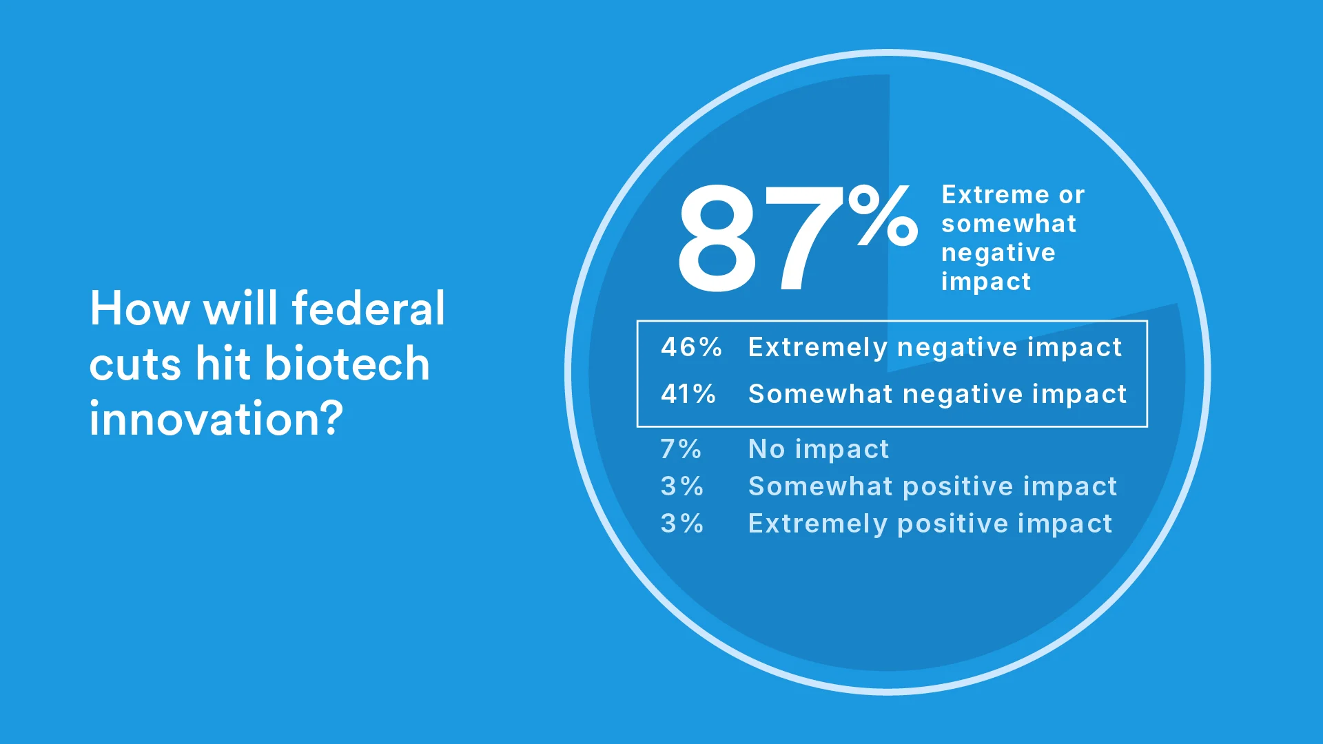 When asked directly about the effect of federal cuts on biotech innovation, 87 percent of respondents predicted a negative impact, with nearly half (46 percent) calling it “extremely” negative.