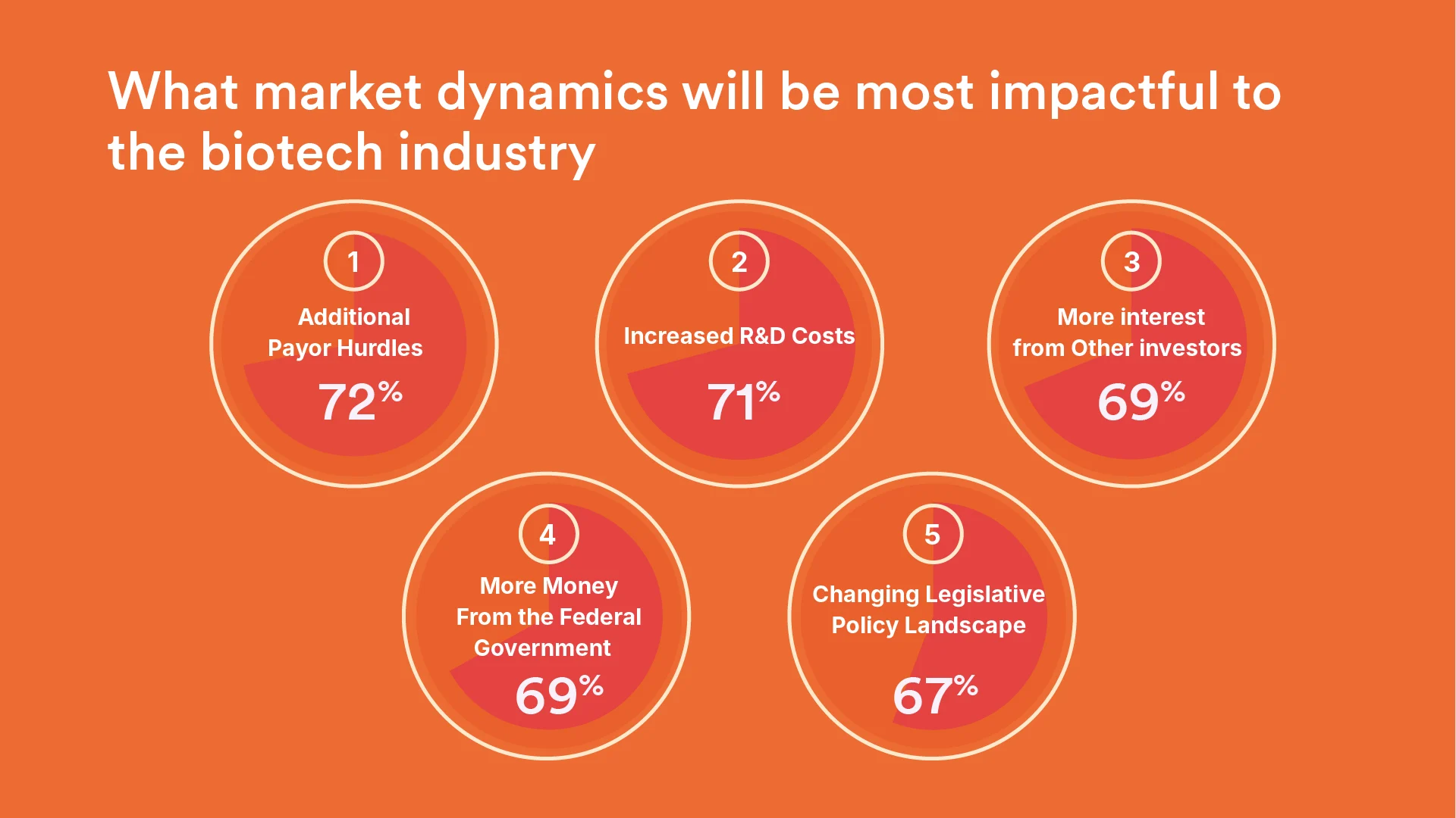 Top on their lists for impacting market dynamics were an overall improvement in the economy (72 percent), increased R&D costs (71 percent), more federal and investor funding (both ranked 69 percent), and changing legislative policy landscape (67 percent).