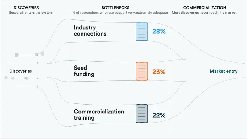 The results of the survey show three broad areas where the system fails the researchers. Technology transfer offices that are equipped to handle patents effectively but are not staffed or structured to offer connections to industry. Only 28% rated their TTOs as effective at building those connections. Another major roadblock is continuity of capital, with three out of four researchers unable to fund basic proof-of-concept work, preventing their ability to advance discoveries far enough to attract outside investment. Finally, a near-total absence of commercialization training is the biggest roadblock. Just 22% rated basic workshops offered by tech transfer offices as adequate, the lowest score in the entire survey.